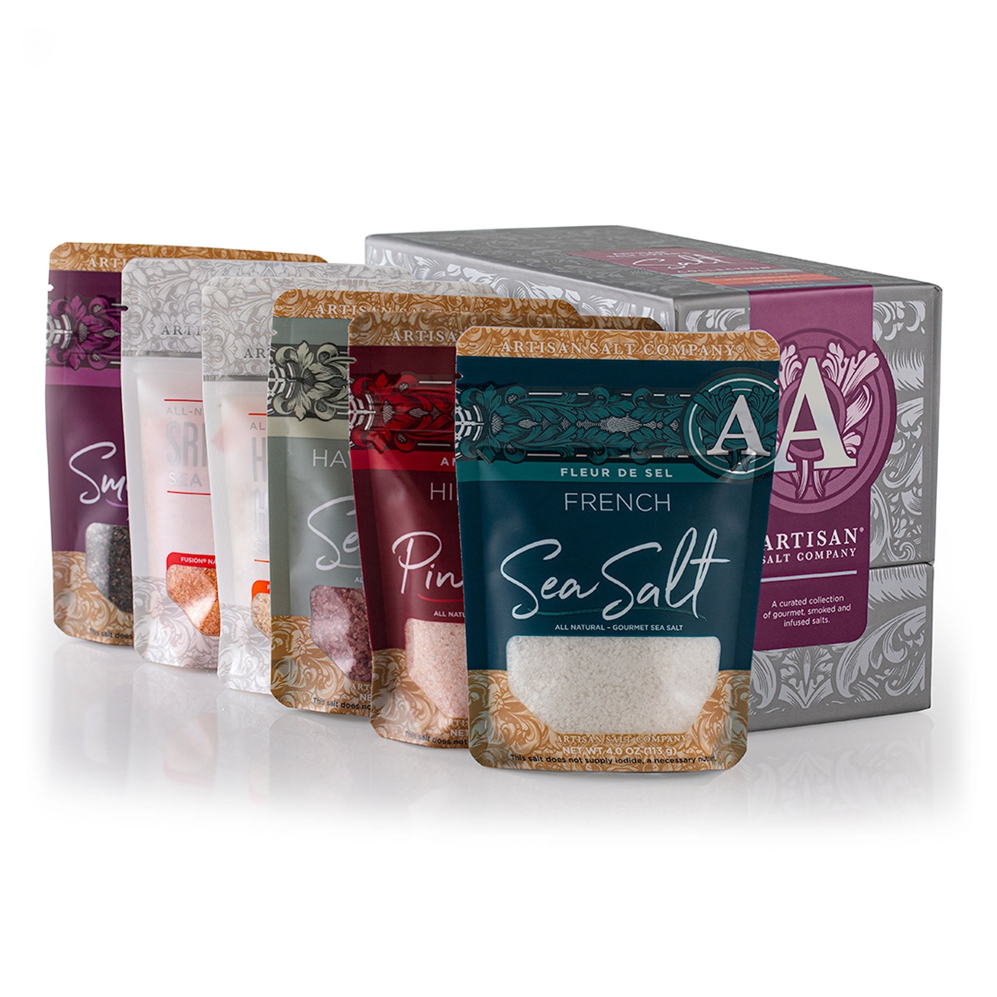 This bold and flavorful salt collection brings together six standout varieties, each crafted for culinary creativity and clean, uncompromising taste. From the mineral-rich Ancient Ocean® Himalayan Pink Salt to the earthy depth of Alaea Hawaiian-Style Salt infused with volcanic clay, every pouch offers a distinct texture and origin story.